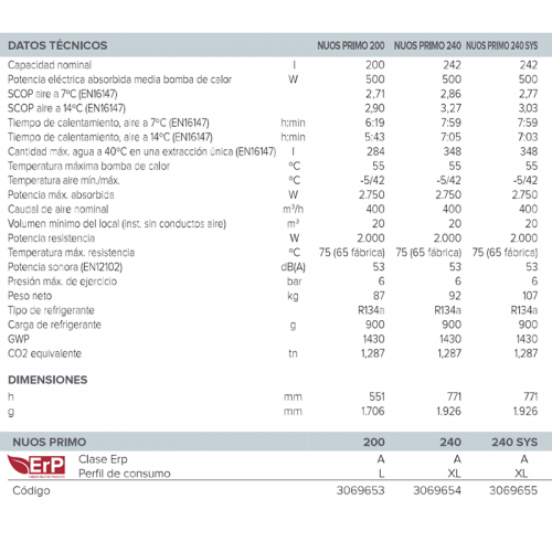 | Modelo | NUOS Primo HC 200 | NUOS Primo HC 240 | NUOS Primo HC 240 SYS |